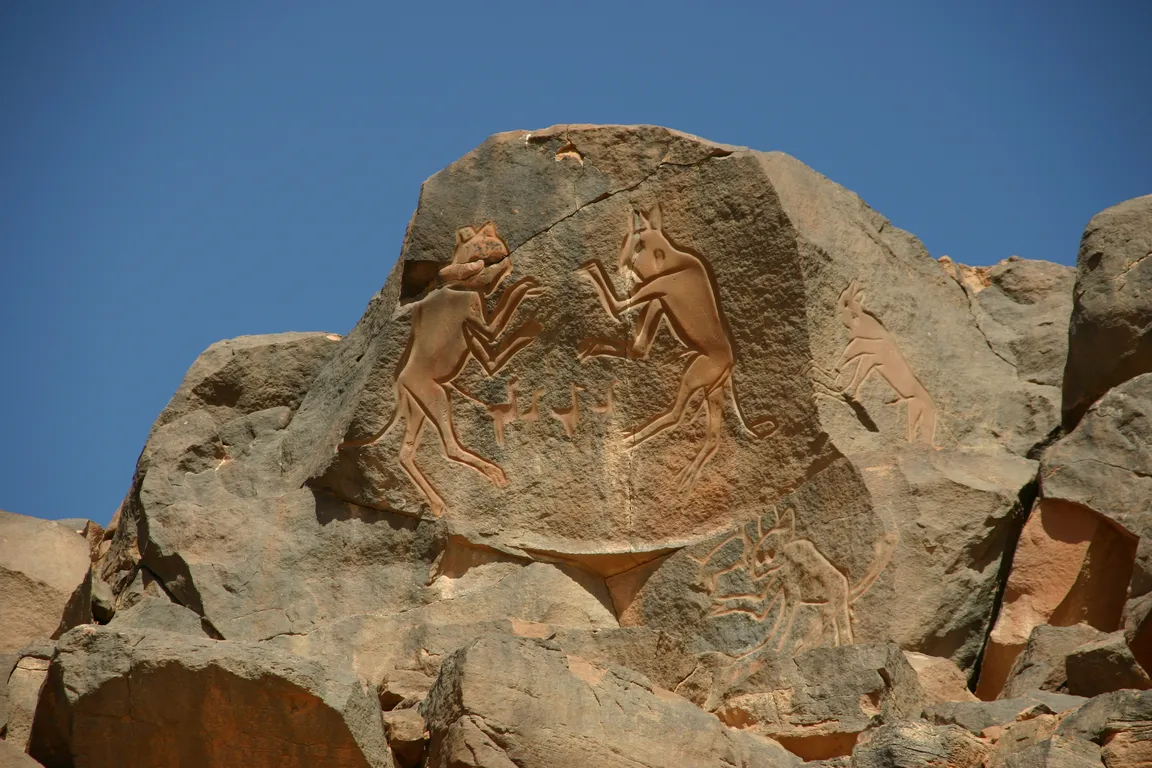 Tot de afgebeelde dieren behoren olifanten, giraffen, struisvogels en katachtige roofdieren. Duidelijk is dat de leefomstandigheden hier duizenden jaren geleden een stuk vriendelijker waren dan nu en meer leken op de hedendaagse Afrikaanse savanne. Afbeeldingen van kamelen zijn zeldzaam omdat het dier pas kort voor onze jaartelling in de Sahara is geïntroduceerd.